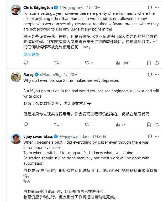 我去看了推特上围绕这句话的讨论。有人说在安全和合规严格的行业里,LLM 根本不能用;也有人觉得工程师不会消失,代码依然需要人写,只是工具变了。那种“不是终结,而是转变”的声音让我稍稍安心,但焦虑仍在,因为现实会把转变压缩成时间表。