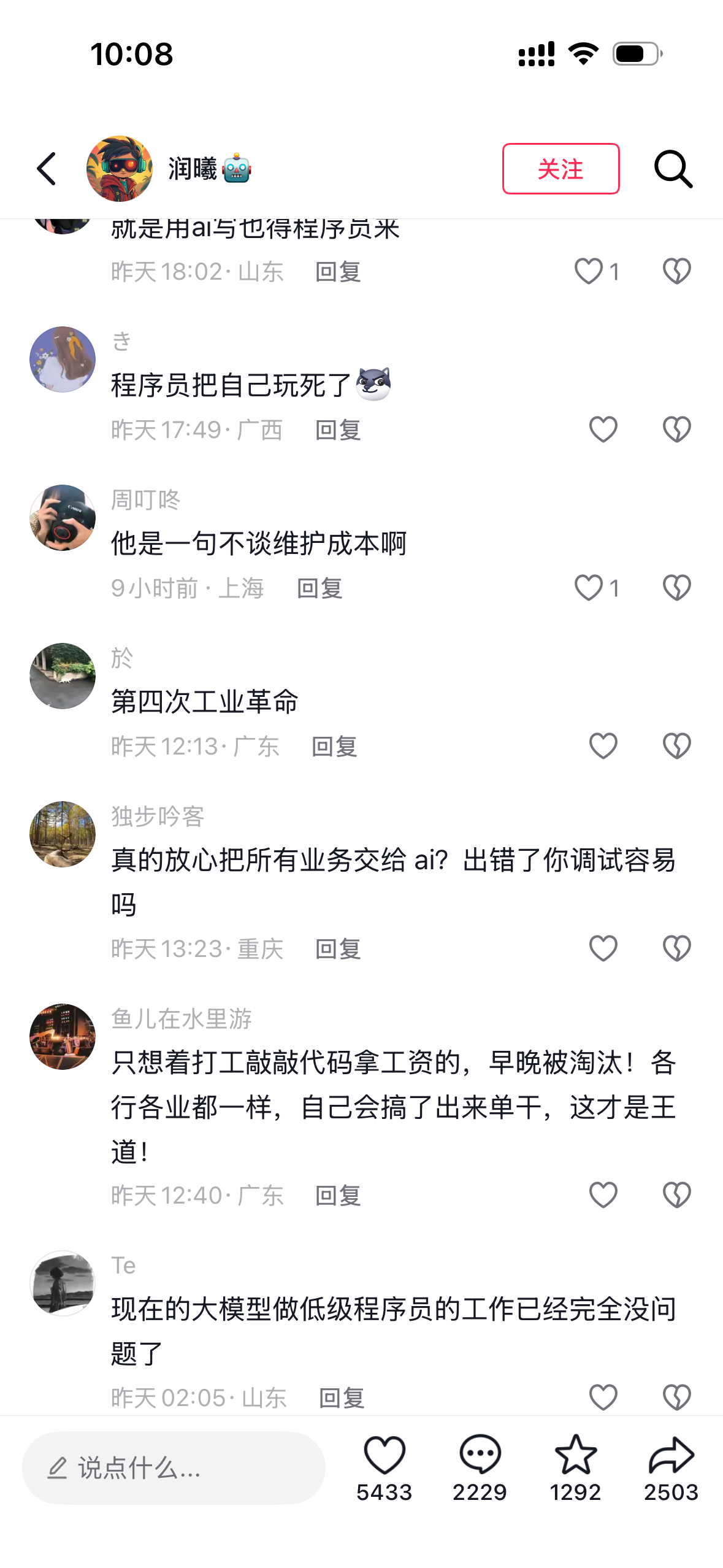 同样的主题到了抖音,情绪更直接:有人说“程序员早晚被替代”,有人说“人类写代码只是过程,终点是自动化”。评论区里很少看到“结构性的分析”,更多是一种对就业和身份的本能担心。那一刻我突然意识到,AI 影响的不只是工具链,还会改变我们对职业安全感的理解。